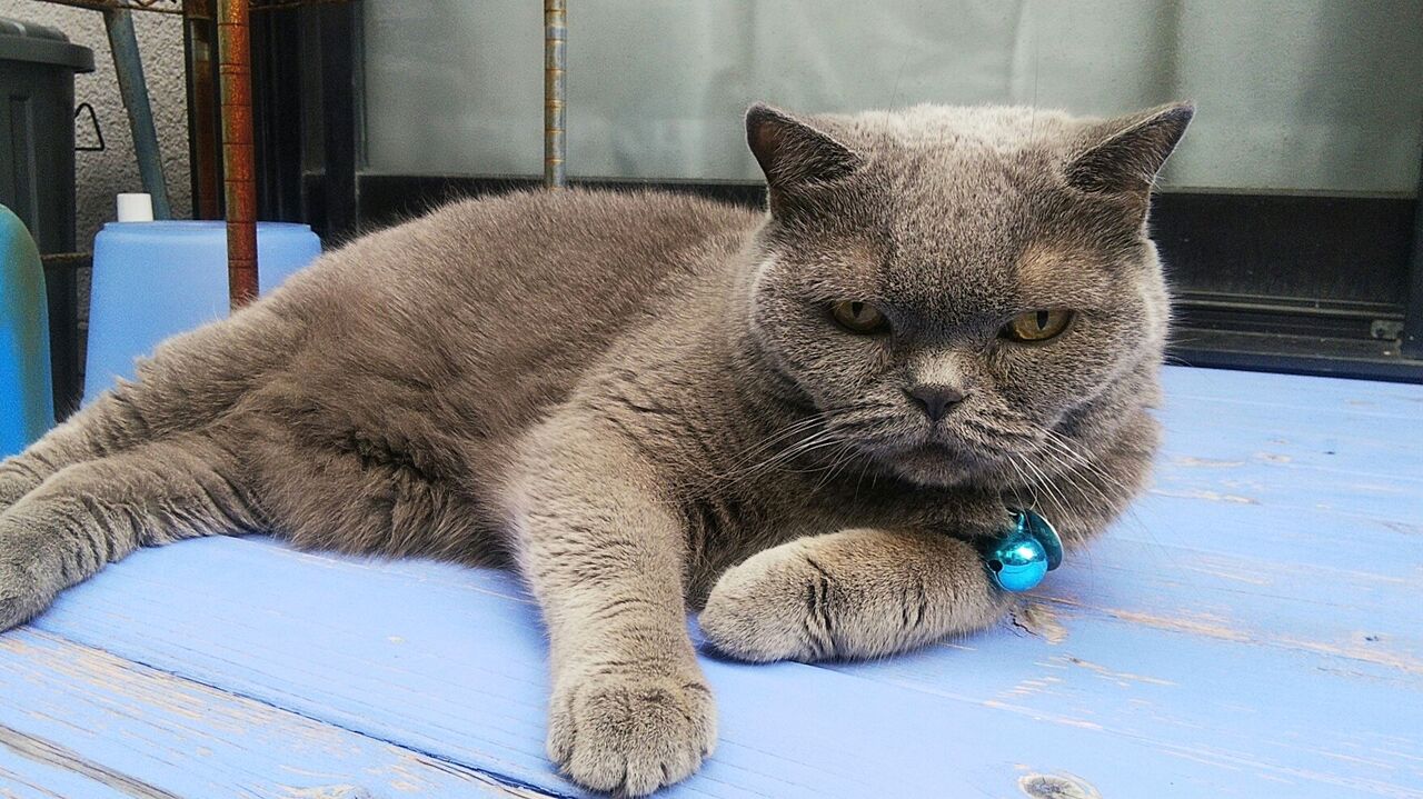 ブリティッシュショートヘア・ブルーのボニー。毛色は1色のグレーです。